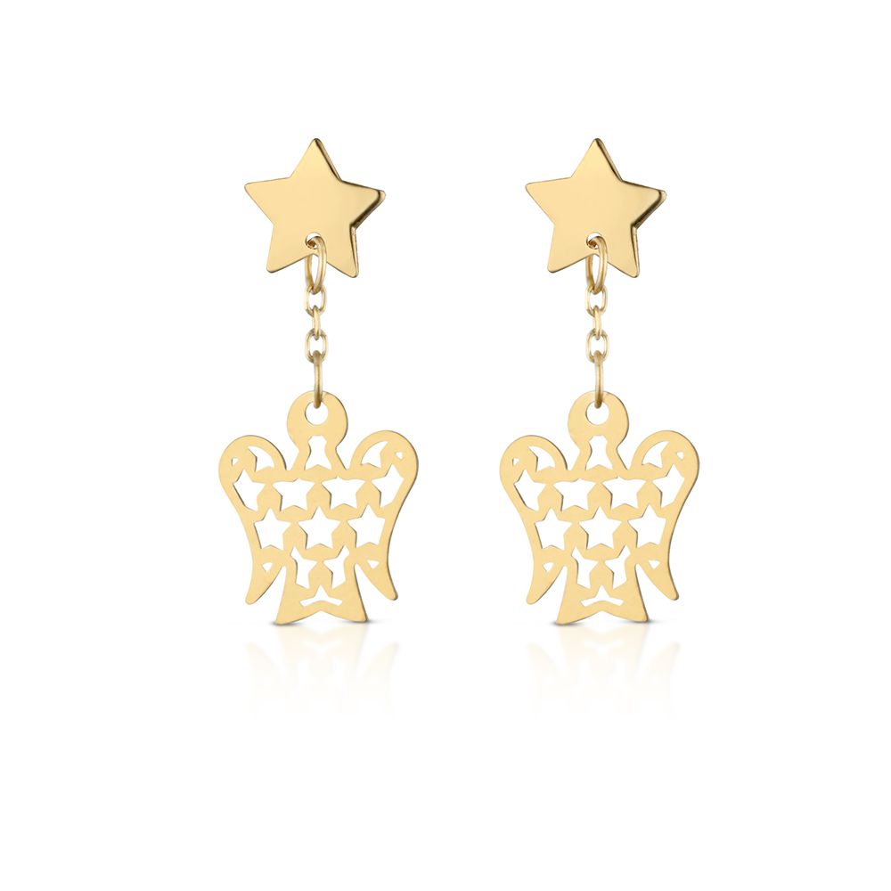 Orecchini con Angeli charm traforati e Stelle a lastra in oro giallo.