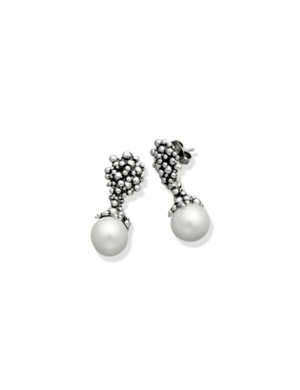 Eleganti decori, ispirati alla suggestione delle bollicine di champagne, per questi orecchini in argento realizzati completamente a mano, in azienda, con la tecnica antica della fusione a cera persa. Un incontro luminoso tra le perle d'acqua dolce e l'argento brunito.
