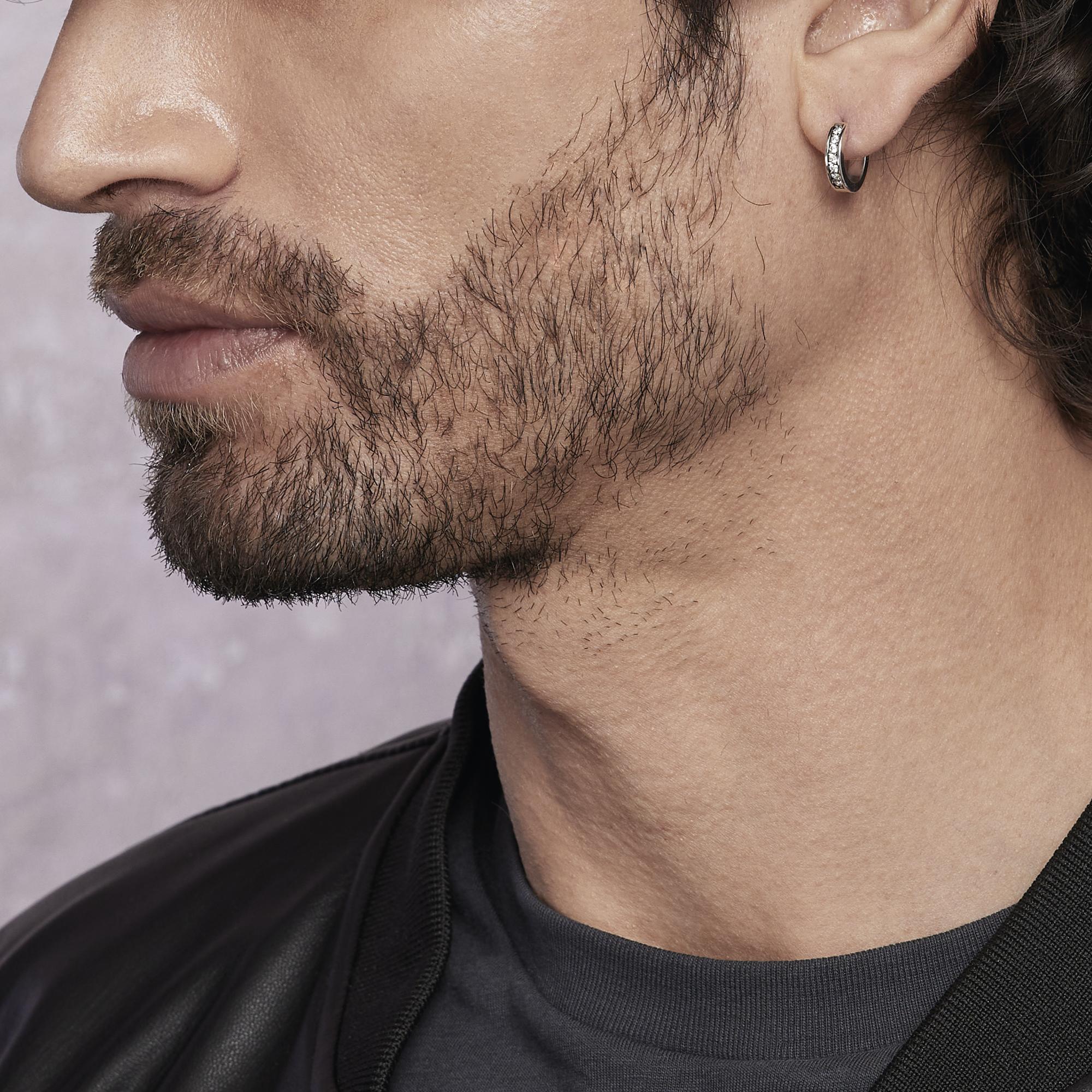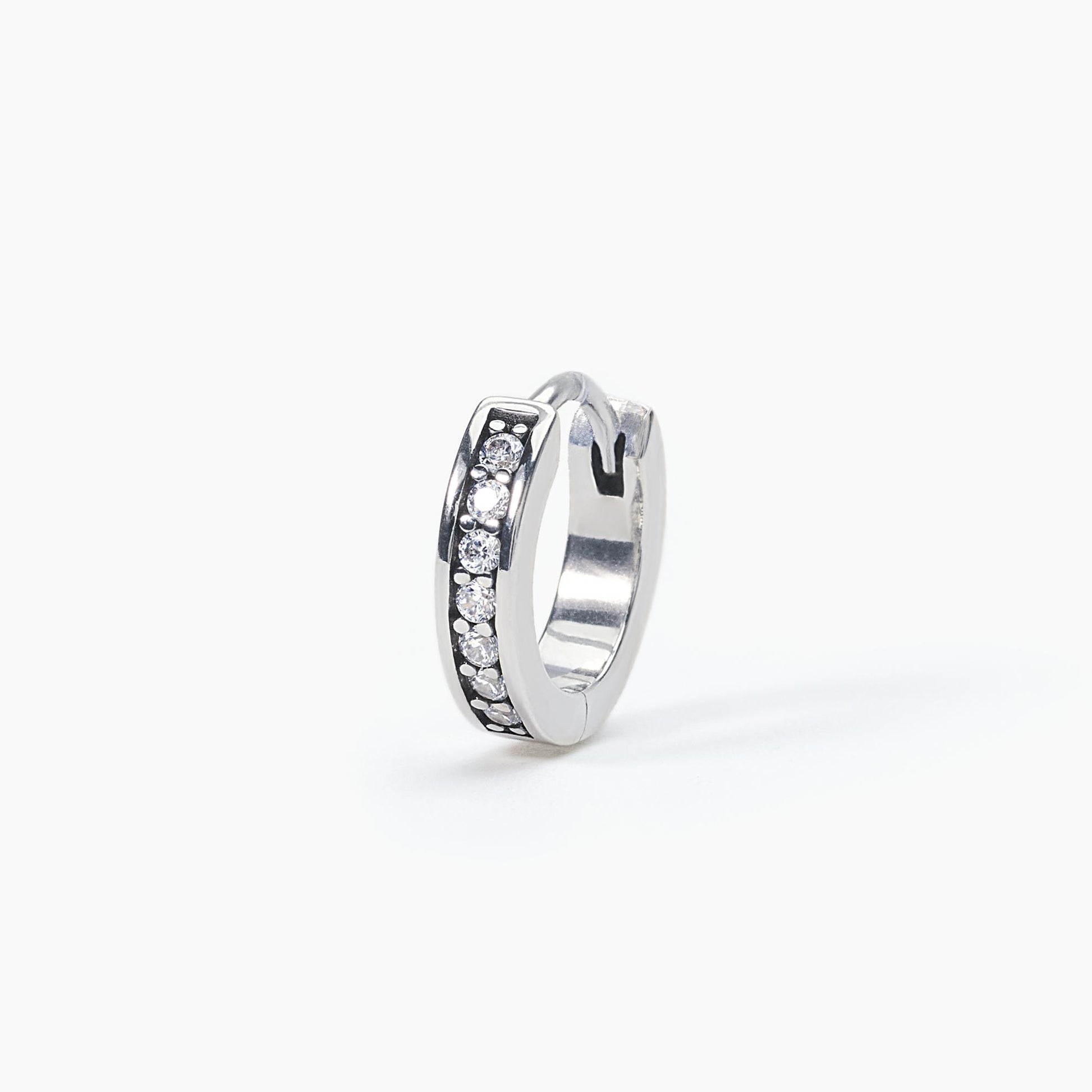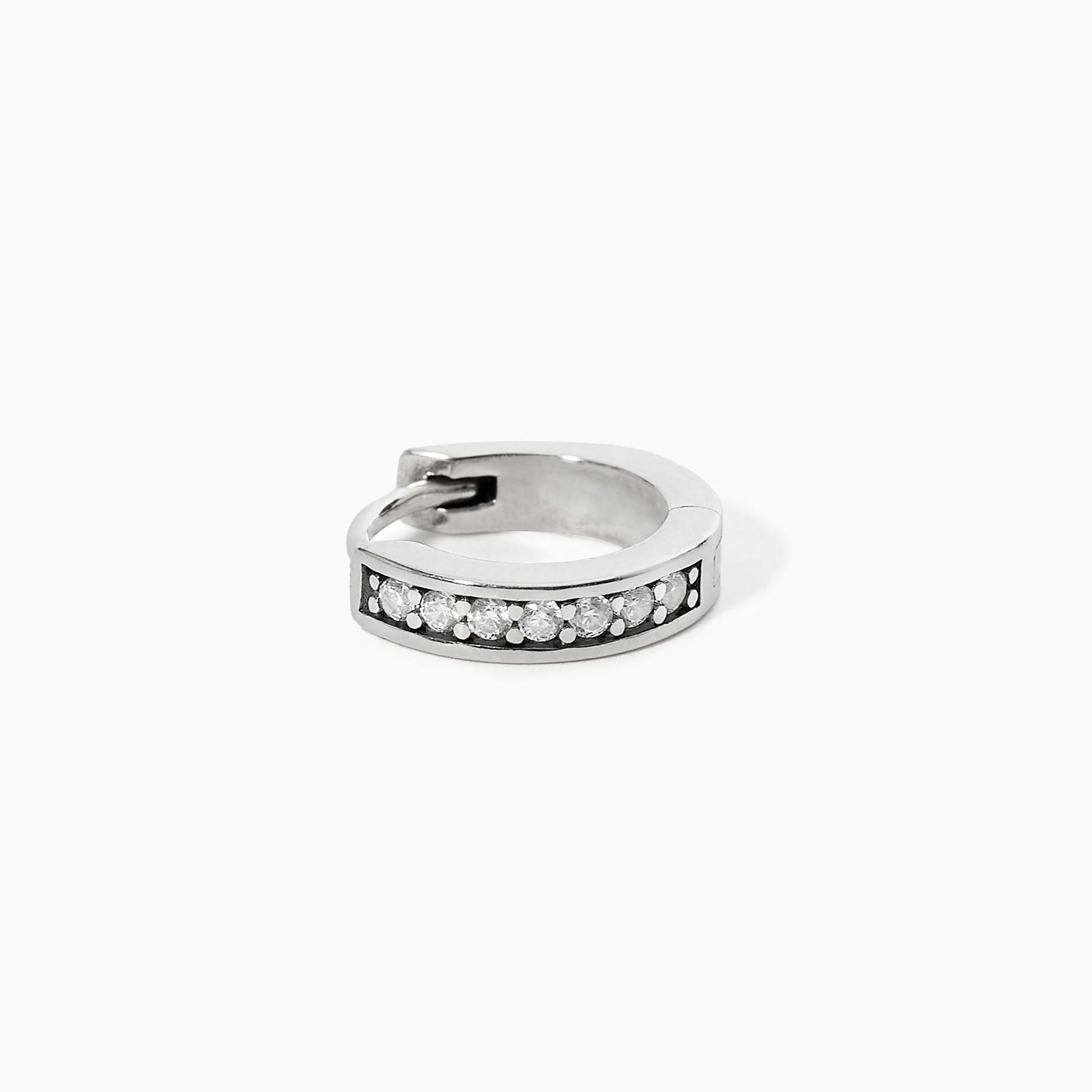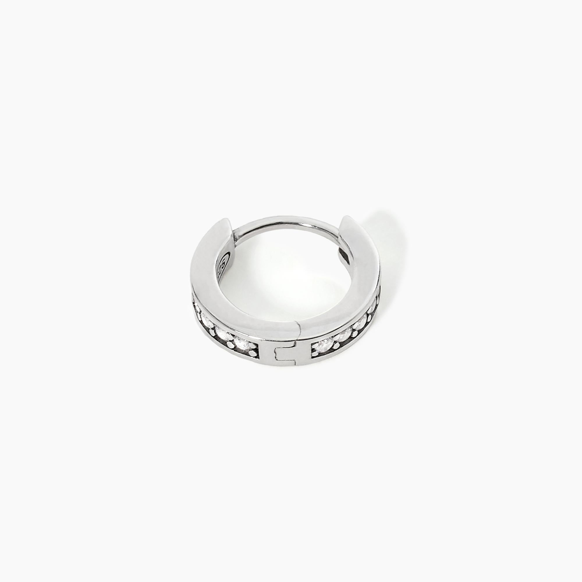 Orecchino a cerchio in argento rodiato con zirconi bianchi.