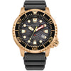 Cassa in acciaio placcato oro rosa, cinturino in morbido poliuretano. Vetro minerale. Ghiera girevole unidirezionale. Indici e sfere ad alta luminosità. Fondo e corona serrati a vite. WR 20 bar.