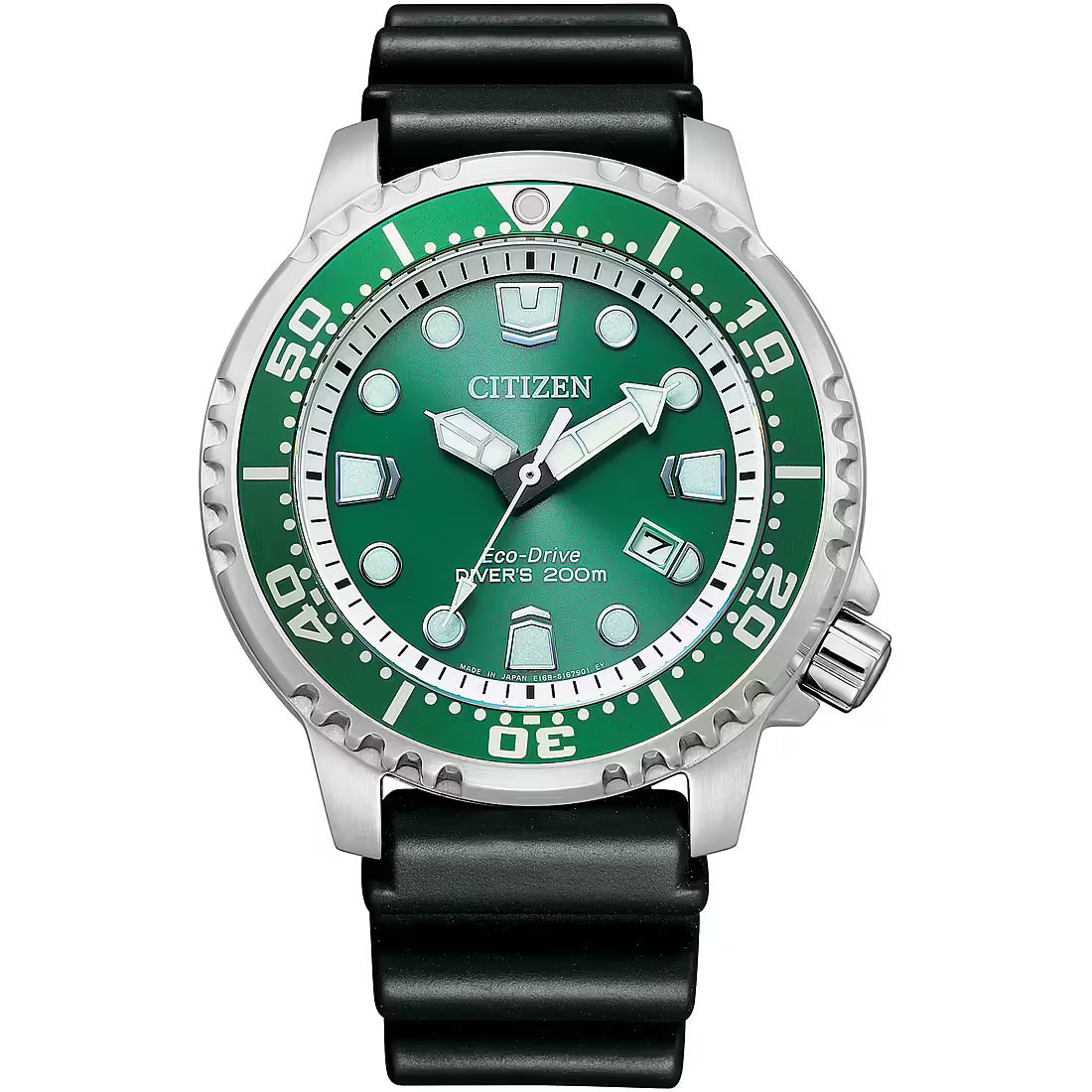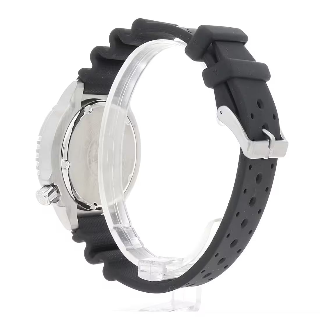 Cassa in acciaio, cinturino in morbido poliuretano. Vetro minerale. Ghiera girevole unidirezionale. Indici e sfere ad alta luminosità. Fondo e corona serrati a vite. WR 20 bar.