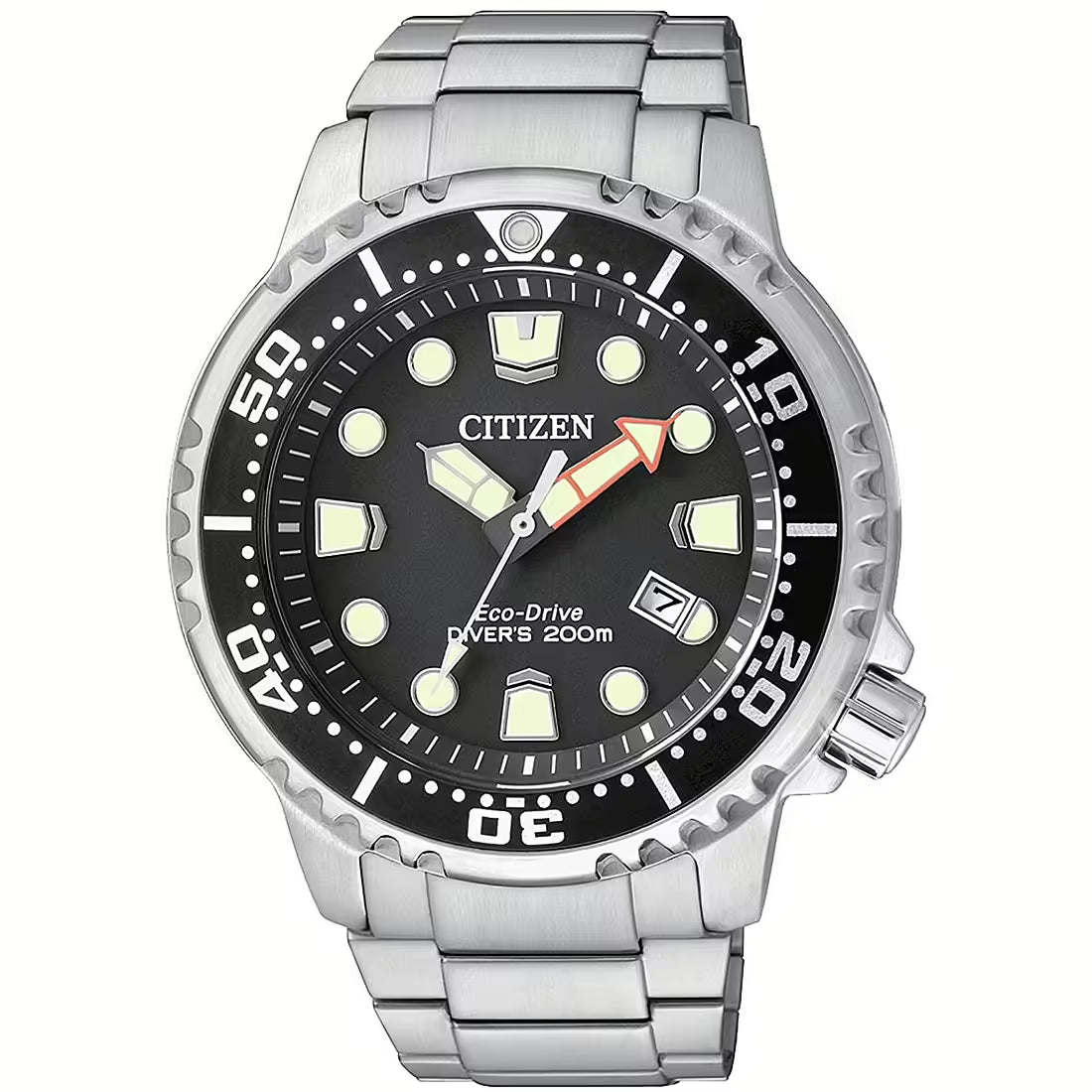 Cassa in acciaio. Bracciale in acciaio con doppia chiusura di sicurezza e sistema di regolazione per l`indossabilità sopra la muta. Vetro minerale. Ghiera girevole unidirezionale. Indici e sfere ad alta luminosità. Fondo e corona serrati a vite. WR 20 bar.