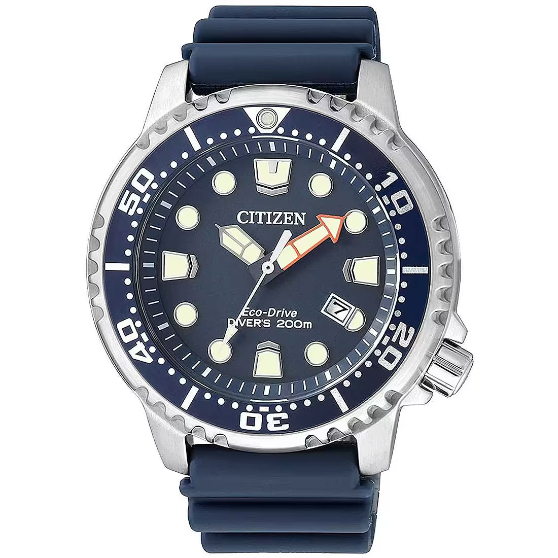 Cassa in acciaio, cinturino in morbido poliuretano. Vetro minerale. Ghiera girevole unidirezionale. Indici e sfere ad alta luminosità. Fondo e corona serrati a vite. WR 20 bar.