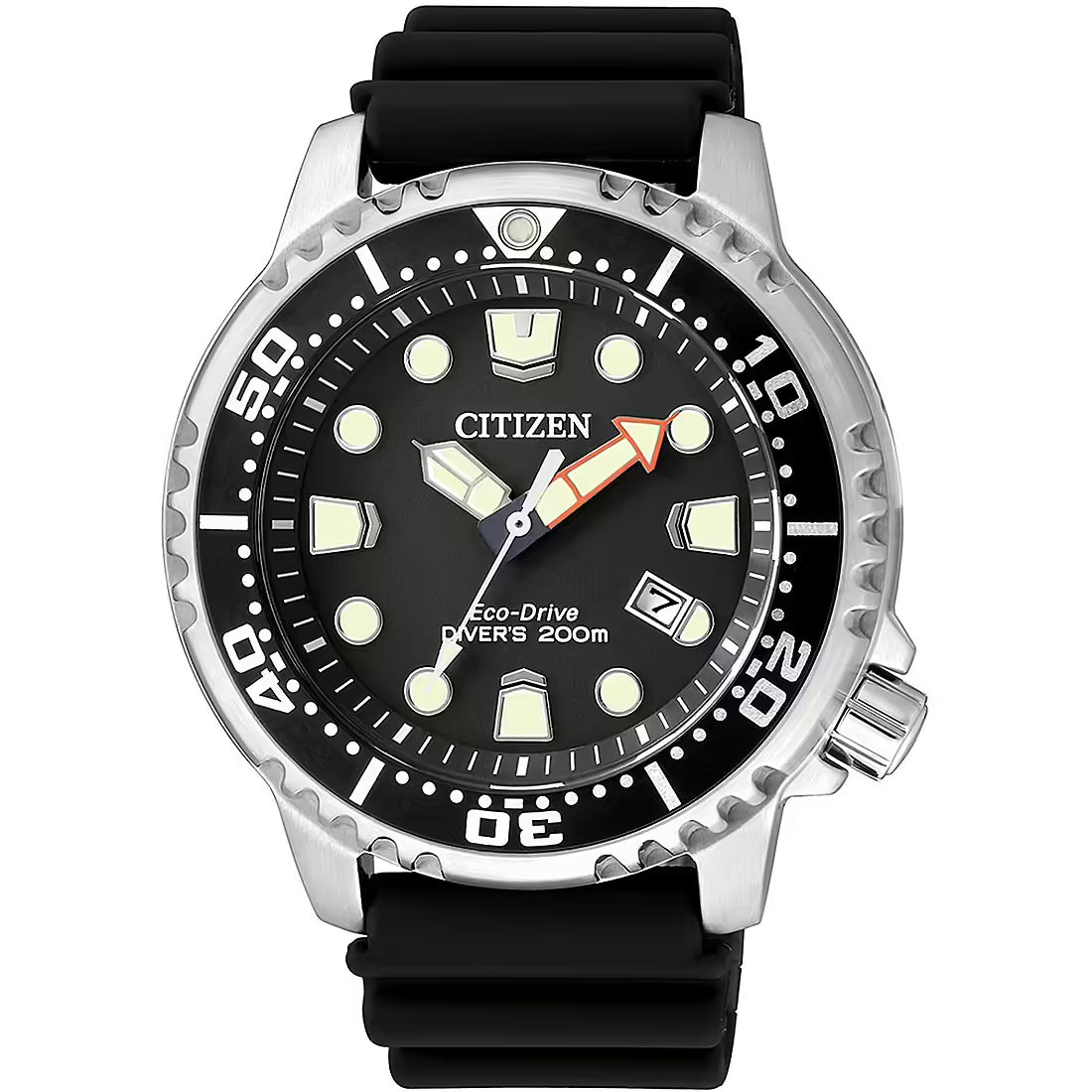 Cassa in acciaio, cinturino in morbido poliuretano. Vetro minerale. Ghiera girevole unidirezionale. Indici e sfere ad alta luminosità. Fondo e corona serrati a vite. WR 20 bar.