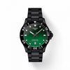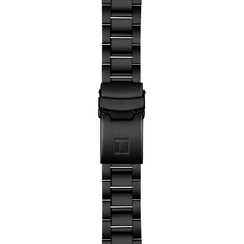In questa versione il Tissot Seastar 1000 T1204103309100 ha la cassa da 40mm in acciaio con rivestimento PVD nero. I numeri e le indicazioni bianche sulla lunetta creano un forte contrasto, e vale lo stesso per le lancette e gli indici del quadrante con indicazione della data, il cui colore sfuma dal nero al verde. Il suo generoso rivestimento in materiale luminoso bianco Super-LumiNova® si illumina di verde al buio. Il bracciale in acciaio inossidabile 316L, anch'esso con rivestimento PVD nero, è dotato di un sistema di cambio rapido e di una chiusura pieghevole con funzione di sicurezza e pulsanti.