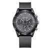 Cassa in acciaio con trattamento black IP con fondo serrato a vite. Cinturino in poliuretano con chiusura di sicurezza. Lunetta in acciaio trattato IP. Vetro minerale curvato. WR 10 bar.