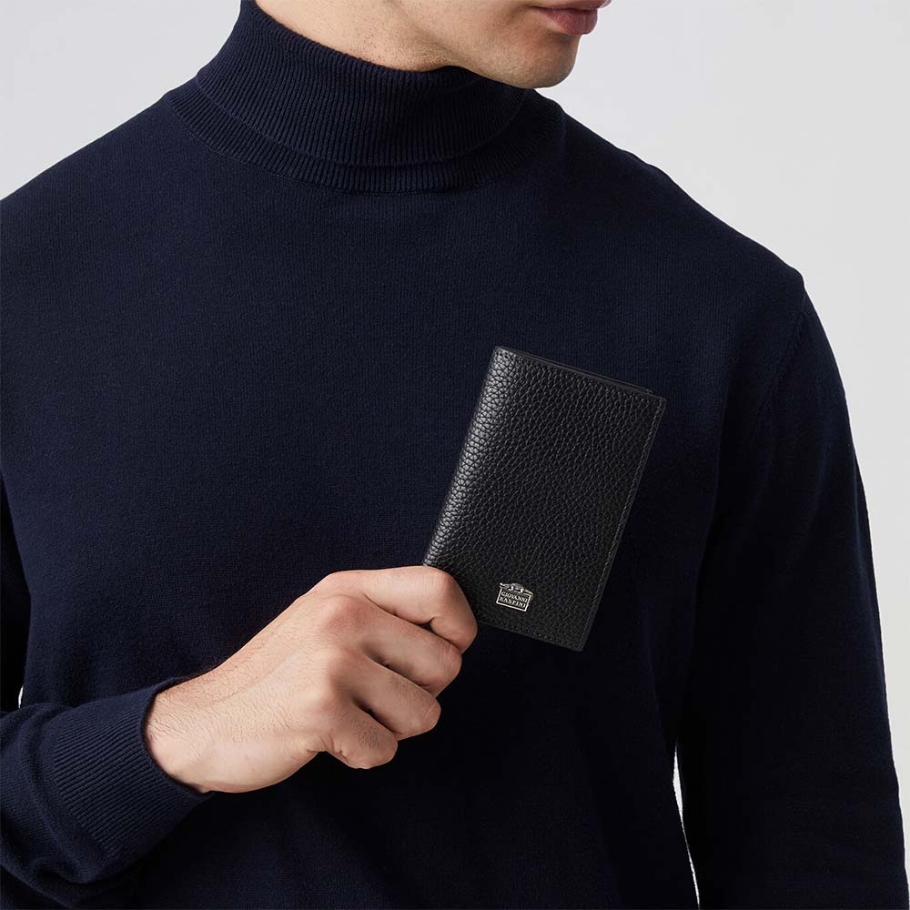 Elegante nel suo pellame di vitello goffrato nero, ed estremamente capiente in pochissimo spazio, questo portafoglio con apertura a libro offre 4 scomparti portacarte e 3 spazi orizzontali portadocumenti, una tasca nascosta ed un ampio scomparto centrale per le banconote. Un portafoglio dal design elegante e minimal. Questo prodotto rappresenta la massima eccellenza artigianale che da sempre contraddistingue il brand Giovanni Raspini, ed è impreziosito da un caratteristico elemento in Argento 925, realizzato in fusione a cera persa e raffigurante il logo del brand in miniatura, sovrastato dall'iconico coccodrillo. Lavorato interamente a mano in Toscana.